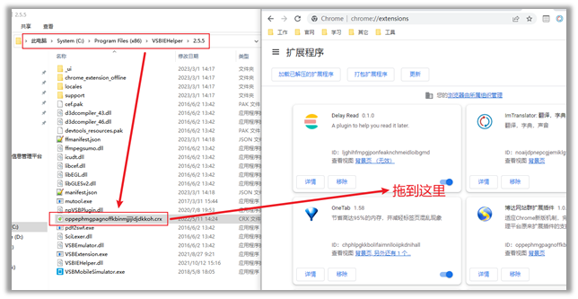 4.4如果没有自动安装,请打开资源管理器,进入文件夹【C:\Program Files (x86)\VSBIEHelper\2.5.5】,将【oppephmgpagnoffkbinmjjijldjdkkoh.crx】文件拖到扩展管理中(注意是鼠标选中后按住左键不放进行拖动)