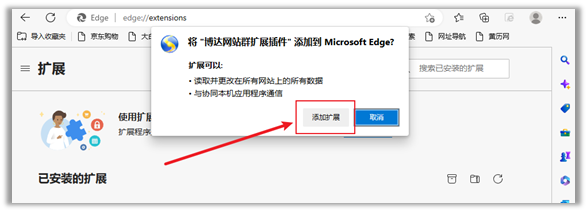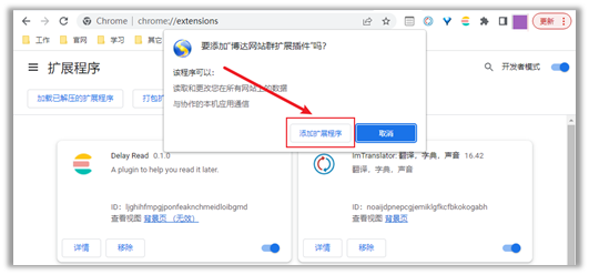 4.6拖放完成后会弹出是否添加扩展的提示框,选择【添加扩展程序】