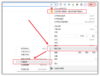 4.1安装程序运行结束后大部分的Chrome浏览器会自动装上扩展,如下图点击右上角的菜单按钮会提示“已添加新的扩展程序”