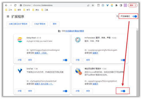 4.3打开【开发者模式】开关,如果已经自动安装了【博达网站群扩展插件】,则点击右下角开关将其启用