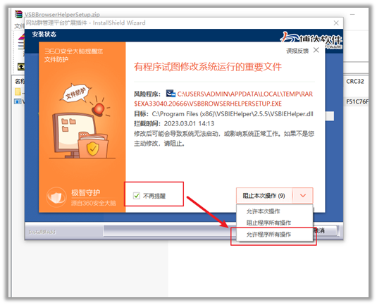 2.如果系统安装了360安全卫士,需要选择【允许程序所有操作】,并勾选【不再提醒】